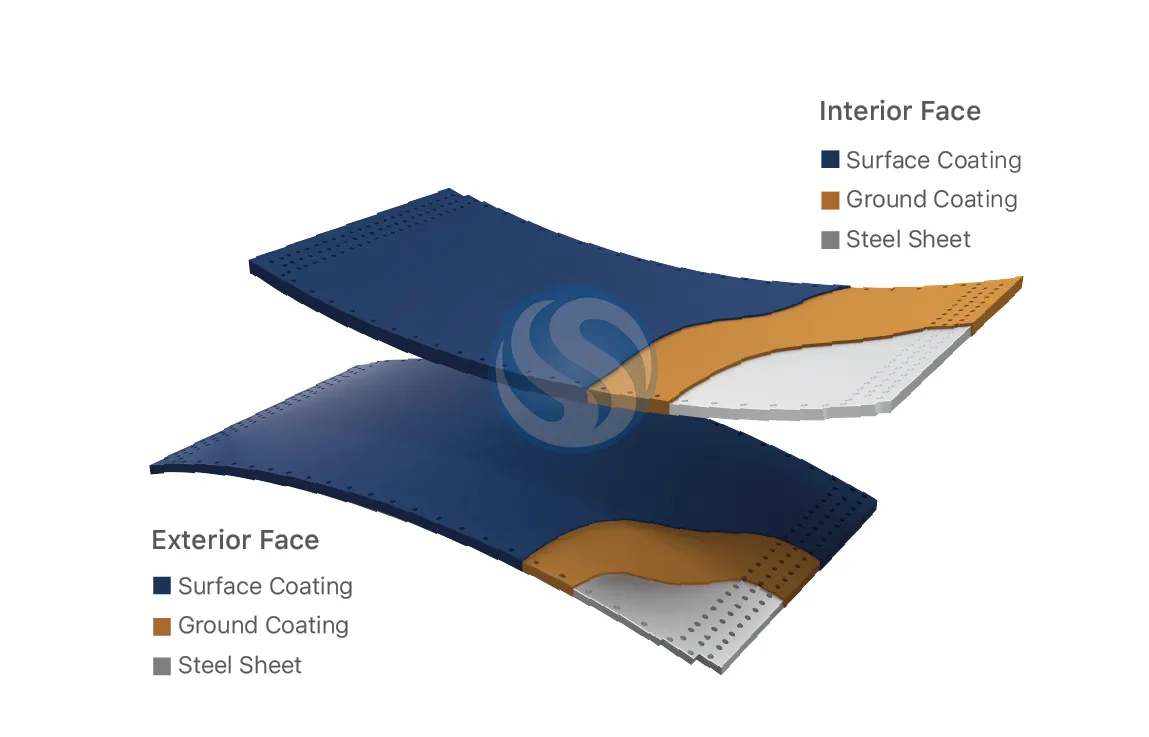 GFS is lined with glass enamel both inside and outside. The enamel is a strong, smooth and shiny silicate coating. It is melted in a special furnace with a temperature range of 780 to 900 degrees Celsius. The steel circular (cylindrical) shell of the tank is made of two layers of glass fused sheets, coated on both sides. These plates are fixed with special high-grade bolts and sealed by a continuous flexible silicone (sealant).